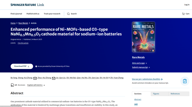 近日,公司2022级资源与环境硕士研究生杨波同学,以第一作者在环境材料领域一区、TOP期刊Rare Metals(IF:9.6)发表题为“Enhanced performance of Ni-MOFs-based O3-type NaNi0.5Mn0.5O2 cathode material for sodium-ion batteries”的研究论文。钟胜奎教授为文章通讯作者。