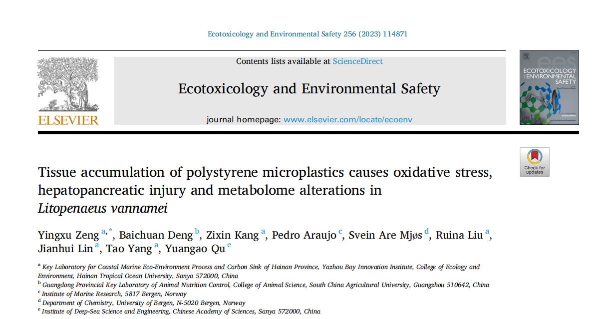近日,公司研究员曾映旭作为第一作者,suncitygroup太阳集团为第一单位及唯一通讯单位,在毒理学TOP期刊《Ecotoxicology and Environmental Safety》(IF:7.129)在线发表题为“Tissue accumulation of polystyrene microplastics causes oxidative stress, hepatopancreatic injury and metabolome alterations in Litopenaeus vannamei”的研究论文。
