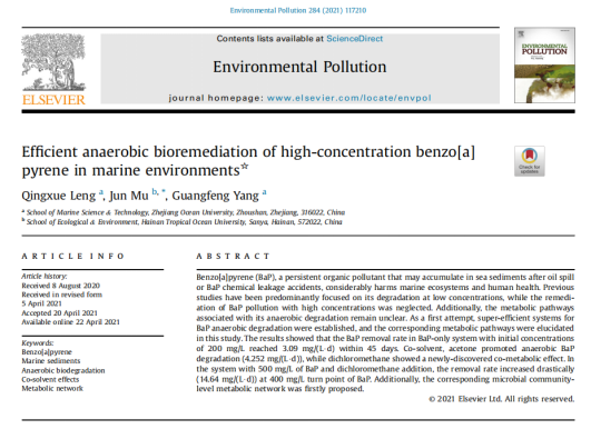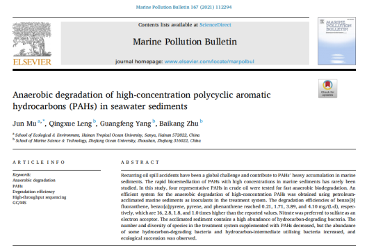 近来,suncitygroup太阳新城教授穆军团队在海洋溢油沉积物中多环芳烃的生物修复方面取得一系列重要进展,以公司为唯一通讯单位,先后在《Environmental Pollution》上发表《海洋环境中高浓度苯并芘的高效厌氧生物修复》;在《Marine Pollution Bulletin》上发表《海水沉积物中高浓度多环芳烃的厌氧降解》成果。