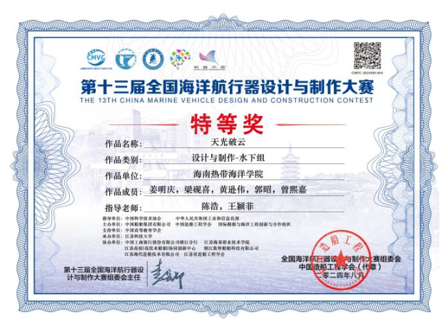 8月10日至11日,第十三届全国海洋航行器设计与制作大赛在江苏科技大学举行。本次大赛由中国科学技术协会与工业和信息化部共同指导,中国船舶集团有限公司、中国造船工程学会、国际船舶与海洋工程创新与合作组织联合主办,江苏科技大学承办。公司研究生黄逊伟参与作品“双目三视招潮蟹ROV”获全国特等奖。